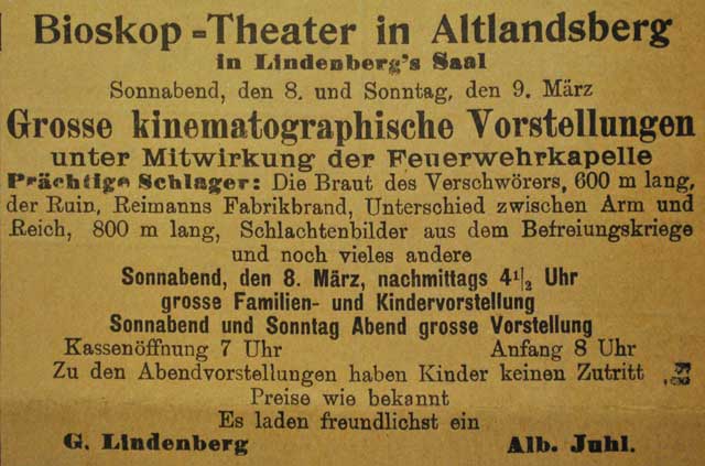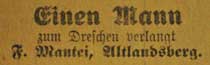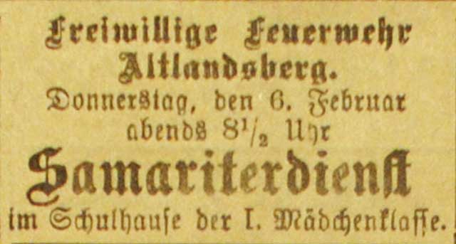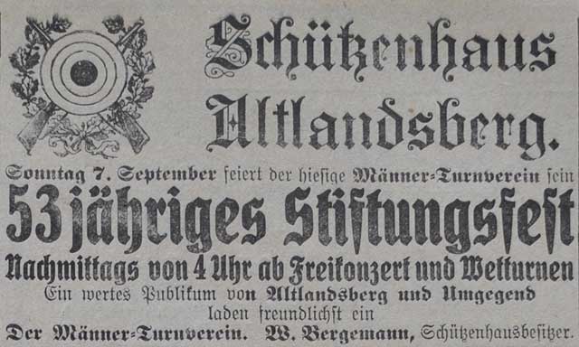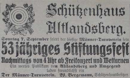 Der Einzige aus Altlandsberg, der die Schlacht bei Leipzig und zwar bei der Artillerie gekämpft hat, war der Vater des Kaufmanns Albert Palm. Er wurde mit dem Eisernen Kreuz und dem russischen St. Georgsorden dekoriert und starb im Jahre 1872 im Alter von 80 Jahren. Ostbahnzweckverband. Der Verband hielt am Dienstag eine Delegiertenversammlung ab, zu welcher über 60 Vertreter aus den Ostbahnvororten erschienen waren. ... Besonders in der Verkehrsfrage soll einen Verständigung erzielt werden: der Wunsch nach Schnellbahnen wird immer dringender. Die Vertreter der Werneuchener Strecke verlangen den Vorortverkehr, der auch von Seiten des Verbandes erstrebt werden soll. ... Neuerdings ist ein großer Verschiebungsbahnhof zwischen Mahlsdorf und Hoppegarten, das demnächst einen besonderen Rennbahnhof erhält. für den bereits 950000 Mark bewilligt sind, vorgesehen, von dem der Umgehungsbahn nach Süden über Cöpenick - Grünau nach Michendorf - nach Norden westlich Altlandsbergs nach Werneuchen (?) gehen soll.
