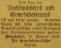 Der Zentralverband der Gemeinden Preußens warnt vor dem Eintritt in die Laufbahn der Gemeindebeamten. Wer nicht eine ganz gediegene Bildung hat und besonders befähigt ist, hat keine Aussicht weiterzukommen. Der Beruf ist überfüllt, das Einkommen gering. Auf öffentlich ausgeschriebene Stellen mit Monatseinkünften von 60-80 Mark - ein Einkommen, für das heutzutage kaum ein Arbeiter arbeite - gingen 100 und mehr Bewerbungen ein. Auf rund 8000 eingestellte Beamte im Bureau- und Kassendienst kommen rund 16000 Lehrlinge, Gehilfen usw., d.h. für jede Beamtenstelle waren bereits 2 Wartende vorhanden. Geschäftsplan für die Musterung der Militärpflichtigen im Aushebungsbezirk Niederbarnim II. Altlandsberg im Restaurant „Schützenhaus“. Am Mittwoch, den 5. März 1913. Musterung der Gestellungspflichtigen aus den Ortschaften: Ahrensfelde, ..., Eiche, ..., Mehrow, Gemeinde und Gut, ... Am Donnerstag, den 6. März 1913. Musterung der Gestellungspflichtigen aus den Ortschaften: Blumberg, Gemeinde und Gut, ..., Hellersdorf mit Wuhlgarten, ... Am Freitag, den 7. März 1913 ...: Hönow, ... |