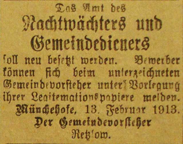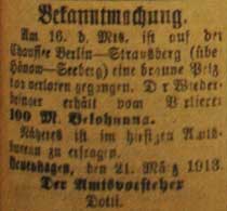 Schöffengerichtssitzung am 15. April 1913. Vorsitzender: Amtsrichter Haack, Schöffen: Kaufmann Paul Andree - Altlandsberg und Gutsbesitzer Paul Döberitz - Hönow. ... Der Kutscher Paul Strehmann von hier hatte wegen des Aufschließens mit dem Nachtwächter Differenzen bei denen er sich zu Beleidigungen hinreißen ließ, die ihm 20 Mark Geldstrafe einbrachten.
