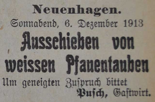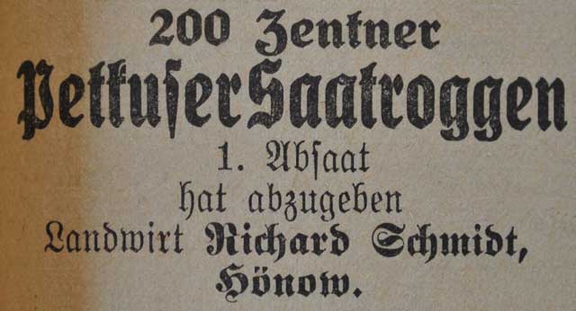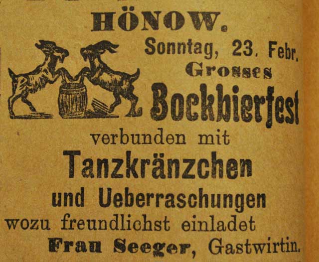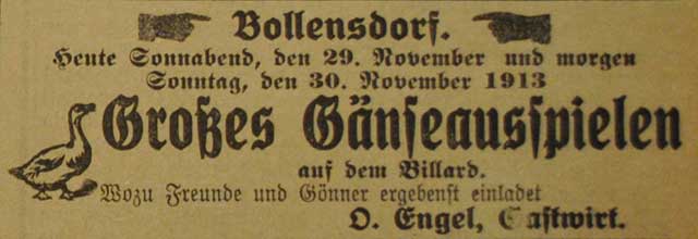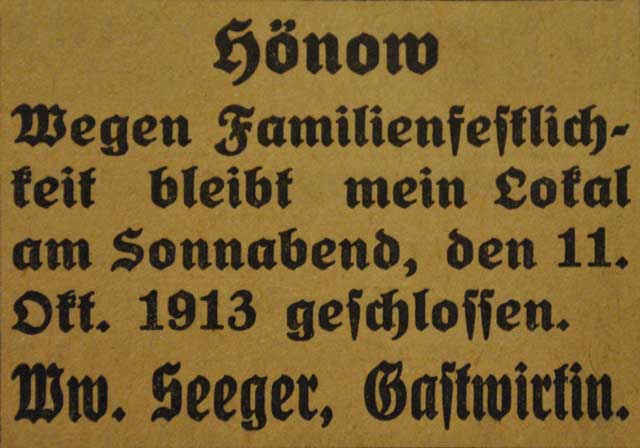 Der Stadtsekretär Behrens ist wegen des gegen ihn schwebenden Disziplinarverfahrens vorläufig vom Regierungspräsidenten seines Amtes enthoben worden. Unser Jahrmarkt ist im Aussterben. Was an Verkäufern da war, das war wirklich gleich null, und was man an Einkäufern sah, das war noch unter null. Die Zeiten sind anders geworden, und der Jahrmarkt, der früher viel Geld nach unserer Stadt brachte, führt nur ein Scheindasein. - Die in den letzten Tagen stattgefundene Musterung brachte ein wenig Leben in die Stadt, die Musik spielte dabei die Hauptrolle. Unser rühriger Mitbürger Herr Albert Juhl, veranstaltet am Sonnabend und Sonntag in Lindenbergs Saal große kinematographische Vorführungen. Das sehr reichhaltige Programm enthält ausgezeichnete Schlager und so dürften sich die Vorstellungen für die Besucher zu einem großen Vergnügen gestalten. Einführung eines brandenburgischen Geflügelzuchtbuches. Von der Landwirtschaftskammer für die Provinz Brandenburg wird beabsichtigt, reinrassige Geflügelzuchten der Provinz Brandenburg mit einwandfreiem Leistungsnachweis als Stammzucht anzuerkennen und für sie Zuchtbücher anzulegen, aus denen der Abstammungsnachweis geführt werden kann. Neuenhagen. Unser Ort bereitet für den kommenden Montag eine große Feierlichkeit vor. Am Vormittag ist Kirchgang und am Abend findet in Fagersterns Saal ein großer Kommers statt. Bei der Volkstümlichkeit der Veranstaltung dürfte diese die lebhafteste Beteiligung der Einwohnerschaft finden. Hönow. Der Landwirt Richard Schmidt ist als Schiedsmannsstellvertreter für den Schiedsmannsbezirk 25 des Kreises Niederbarnim auf eine dreijährige, vom 22. Februar 1913 ab laufende Amtsperiode verpflichtet worden.