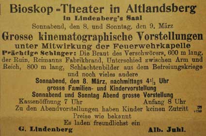 Der gestrige Sonntag brachte uns Sturm, Regen, Hagel, Schnee und ein ziemlich lang anhaltendes heftiges Gewitter am frühen Nachmittag. In Berlin trat das Wetter ebenfalls recht bösartig auf, das Geschäft hat darunter ganz bedeutend gelitten. In unserer Forst ist irgend ein besonderer Schaden nicht entstanden. Neuenhagen. In unserem Ort richtete am Sonntag das schwere Gewitter mit dem starken Sturm, welches gegen 3 ½ Uhr heraufzog, manchen Schaden an. So legte der Sturm die Mauer der neuen Schule, etwa 20 Meter, glatt um, auch der eiserne Schonstein unseres Elektrizitätswerkes wurde in der Mitte eingeknickt. Es wurde sofort die Baufirma telegraphisch benachrichtigt, um den Schaden zu bessern und weiteres Unglück zu verhüten. Blumberg. Der Betrüger, der in Petershagen kein Geschäft machen konnte, hat hier Geld verdient. Er hat hier auch Dienstboten usw. empfohlen und in vielen Fällen 3 Mark Betrag eingesteckt. Kalkberge. Unser historisches Bergfest soll nun der Vergangenheit angehören. Der neue Herr Obergrat will es so. Da aber die hiesigen Gastwirte und fast alle Geschäftsleute einen Vorteil von der „Kirmes“ hatten, so sollen alle geeigneten Schritte getan werden, um das traditionelle Fest in der bisherigen Form zu erhalten. |