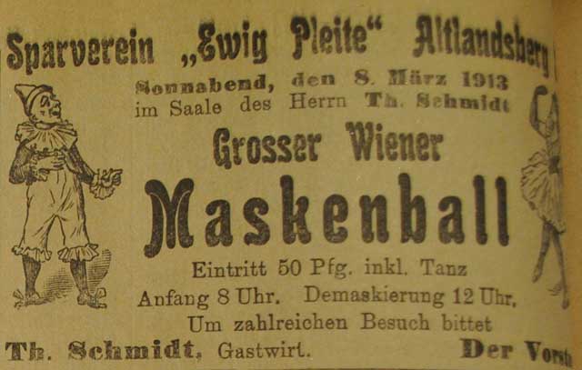 Schöffengerichtssitzung am 4. März 1913. Vorsitzender: Amtsrichter Haack, Schöffen: Kaufmann Puhlmann - Altlandsberg und Mühlenbesitzer Mett - Hönow. ... Wegen Duldung von Glücksspielen erhielten die hies. Gastwirte Paul und Gustav Scholz je 25 Mark Geldstrafe. Der Gerichtshof erkannte die Zwangslage an, in der sich viele Restaurateure befinden, wenn nach Skat oder 66 noch ein wenig dem Glücksspiele gehuldigt wird. In dem vorliegenden Falle handelte es sich nur um ganz geringe Einsätze.