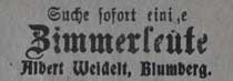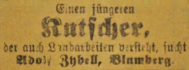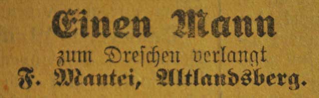Die Magd Emma Franke hat unbefugter Weise ihren Dienst in Blumberg verlassen und dafür ein Strafmandat über 10 Mark erhalten. In diesen sich oft wiederholenden Fällen dreht es sich stets um sich gegensätzlich gegenüber stehende Aussagen. So sagte die Franke aus, sie und andere Mädchen seien immer von einem Knecht belästigt, sie sogar geschlagen worden und als sie ihren Herrn aufgefordert habe, sie zu schützen, sei ihr zur Antwort gegeben worden, sie solle es sich nicht gefallen lassen. Der Dienstherr stellte die Sache so dar, als ob die Franke mit allen anderen Dienstleuten immer Streit gehabt habe. Jedenfalls hat die Franke ihre Sachen gepackt und ist während der Ernte ausgerückt, als sie angeblich wieder einmal gehauen worden war. Das Strafmandat blieb aufrecht erhalten. Einige Mitglieder der Freien Schneiderinnung in Altlandsberg haben beantragt, anzuordnen, daß zur Wahrnehmung der gemeinsamen gewerblichen Interessen des Schneiderhandwerks sämtliche Gewerbetreibende, welche das bezeichnete Gewerbe in Stadt und Amt Altlandsberg und den Gemeinde- und Gutsbezirken Bruchmühle, Neuenhagen, Dahlwitz, Bollensdorf, Fredersdorf, Petershagen, Eggersdorf, Seeberg, Hönow, Marzahn, Mehrow, Eiche, Falkenberg, Wartenberg, Berlin-Hohenschönhausen, Biesdorf, Mahlsdorf und Blumberg ausüben, einer neu zu errichtenden Innung (Zwangsinnung) mit dem Sitze in Altlandsberg anzugehören haben. ... |