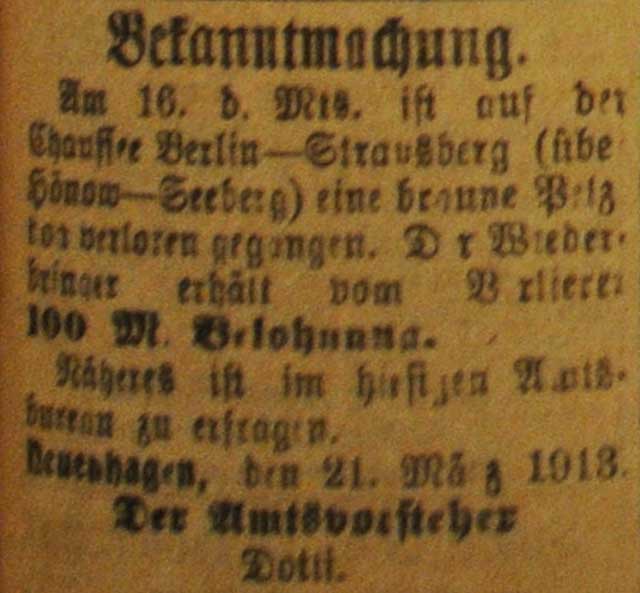 Schöffengerichtssitzung am 27. Mai 1913. Vorsitzender: Amtsrichter Haack, Schöffen: Schmiedemeister Wilhelm Häse - Buchholz, Mühlenbesitzer Gustav Mette - Hönow, ... Der Handelsmann Wilhelm Brötsch aus Seefeld hatte unterwegs auf der Chaussee in der Nähe von Blumberg in einem Graben eine Pferdedecke und verschiedene Teile eines Pferdegeschirrs gefunden. Er zog die Gegenstände mit einem anderen Handelsmann aus dem Wasser in dem Glauben, daß die Sachen von dem Besitzer als unbrauchbar fortgeworfen worden seien. So trieben sie sich lange Zeit auf seinem Hofe umher, aber schließlich benutzte der Angeklagte die Pferdedecke. Es stellte sich heraus, daß die Fundgegenstände dem Gutsbesitzer K. in Seefeld gehörten, der sie verloren hatte. Das Urteil lautete auf 15 Mark Geldstrafe wegen Funddiebstahls.