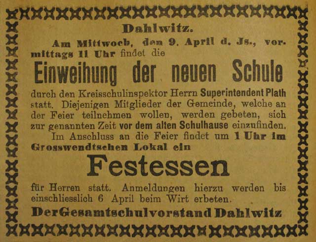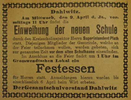 Dahlwitz. Am 9. April vorm. 11 Uhr wird hier die neue siebenstufige Schule durch den Kreisschulinspektor Herrn Superintendent Plath eingeweiht. Wie aus dem Anzeigenteil ersichtlich, findet im Anschluß daran ein Festessen im Lokal des Herrn Großwendt statt.