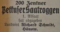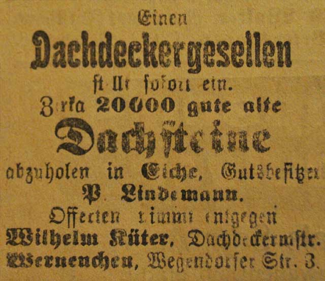 Werneuchen. Im Befreiungskriege fiel am 18. Februar 1813 bei Blumberg als erster Preuße Leutnant Otto von Arnim. Er wurde auf dem hiesigen Friedhof beerdigt. Ihm soll jetzt ein einfaches Denkmal, Granitblock mit Bronzetafel, gesetzt werden. Ein Großneffe stiftete dazu 400 Mark, die fehlenden 200 Mark gibt der Verschönerungsverein. Der letztere will auch gegen 100 Mark zum Kriegerdenkmal beisteuern. Zwei Fliegerabstürze in Johannisthal. Auf dem Flugplatz Johannisthal haben sich am Donnerstag zwei Flugunfälle zugetragen. Bei dem einen blieb der Flieger Dunetz tot auf dem Platze, bei dem zweiten kam die Fürstin Schakowskoy mit Verletzungen davon, während der mit ihr fliegende Wrightflieger Abramowitsch sehr schwere Verletzungen erlitt. Dunetz ist seit Lilienthal das 56. Todesopfer der Luftschiffahrt in Deutschland und der zwölfte, der auf dem Berliner Flugfelde ums Leben kam. ... Einen Dachdeckergesellen stellt sofort ein. Zirka 20000 gute alte Dachsteine abzuholen in Eiche, Gutsbesitzer P. Lindemann. Offerten nimmt entgegen Wilhelm Küter, Dachdeckermstr. Werneuchen, Wegendorfer Str. 3. |