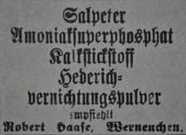 Werneuchen. Die Sonne lachte gestern über unsere Stadt und das war gut so, denn es galt eine Feier, auf die wir uns schon lange gefreut haben, die Einweihung des Kriegerdenkmals. ... Das Denkmal ist eine viereckige schlanke Säule, aus Rot-Meißner Granit, auf der der Adler mit ausgebreiteten Fittichen sitzt. Die Säule steht auf einem Unterbau, zu dessen Plattform, die von einem Geländer umgeben ist, Stufen aus Kunstsandstein von Tiebel und Sohn führen. An der Säule befindet sich das Bronte-Reliefbildnis Kaiser Wilhelm I. ... Hoppegarten. Endlich ist es unserm Amtsdiener gelungen, einen Fahrraddieb festzunehmen, welcher in den Monaten Juli und August fortgesetzt in Dahlwitz und Hoppegarten Fahrräder gestohlen hatte. ... |