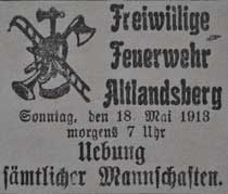 Schöffengerichtssitzung am 19. August 1913. ... Der Sattlergeselle Lehmann hatte, obgleich er Geld besaß, in Werneuchen gebettelt und erhielt 5 Tage Haft, die durch die Untersuchungshaft als verbüßt gelten. Ein großer Zeugenapparat erschien bei der Verhandlung gegen den Schrankenwärter Gustav Müller in Blumberg, der des Diebstahls von Kartoffeln bezichtigt war. In Blumberg werden aus den verschlossenen Loren immer Kartoffeln gestohlen, auch Müller wurde beschuldigt, solche Diebstähle begangen zu haben. Bei der sehr eingehenden Verhandlung konnte jedoch ein strikter Beweis nicht erbracht werden, so daß es der Verteidigung gelang, die Anklage zu entkräften. Müller wurde freigesprochen. Der Chauffeur August Lindner wurde von der Anklage übermäßig Dampf aus dem Auto gelassen zu haben, freigesprochen, weil der Nachweis, daß er das betreffende Auto geführt hatte, nicht als erbracht angesehen wurde. Werneuchen. Gestern früh gegen 9 Uhr ertönte Feuersignal. Der Einwohner bemächtigte sich eine große Aufregung, weil erst vor wenigen Tagen die Scheune von Beator niedergebrannt ist. Es brannte im Gehöft der Frau Ww. Hinze der Stall. ... Unsere Feuerwehr war sofort zur Stelle und griff das Feuer unter Leitung ihres Oberführers, Schlossermeister Knebel an. Auch die herbeigerufenen Feuerwehren aus Altlandsberg mit Amt, Wegendorf, Seefeld, Löhme, Hirschfelde, Weesow, Wilmersdorf, Schönfeld und Buchholz waren bald zur Stelle. Vor allem galt es die anschließende große Scheune, in der 150 Fuder Getreide u. a. lagerten, zu schützen, was den vereinten Anstrengungen glücklich gelang, während vom Stall nicht viel zu retten war. ... Auch hier wird Brandstiftung vermutet, wie sich die Vermutung bei dem Brande der Beatorschen Scheune bewahrheitet hat. Der Brandstifter, ein entlassener Knecht, ist ergriffen worden und hat die Tat eingestanden.