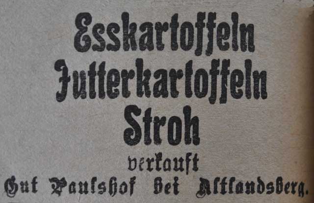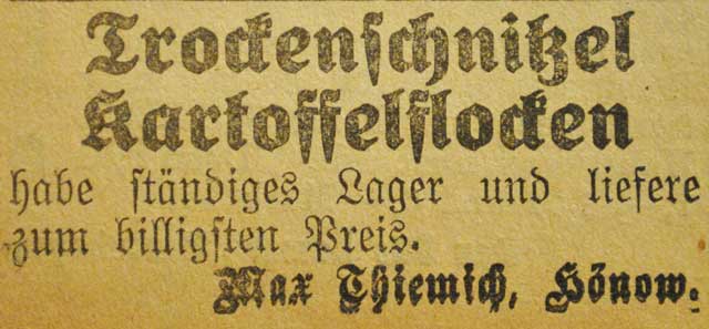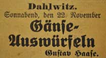 Schöffengerichtssitzung am 29. Juli 1913. ... Frau Marie Teichmann in Dahlwitz sollte in ihrer Weinstube Glücksspiele geduldet haben. Die Beweisaufnahme ergab, daß die Anschuldigung nicht wahr war und so wurde sie freigesprochen. Eine langwierige Verhandlung rief ein Sack gestohlener Kartoffeln hervor, obgleich sich die Kartoffeln nicht im Besitze des Angeklagten vorfanden. Der Schrankenwärter Kurt Wiesener hat bei Blumberg am Tage die Schranken zu bedienen. Der Knecht B. des Gutes Blumberg verlor von seiner Fuhre nach dem Bahnhof Blumberg einen Sack Kartoffeln. Da er nicht imstande war, den schweren Sack wieder aufzuladen, schleppte er ihn an den Rand der Chaussee. Als er aber zurückkam, war der Sack verschwunden. Er meldete den Vorgang der Gendarmerie und auch auf dem Bahnhof und fand nun, daß die Spur eines geschleiften Sackes nach der Bude des Schrankenwärters wies. Man fand auch später die Kartoffeln, aber in zwei Säcke verteilt. Der Verdacht fiel auf den Angeklagten und obgleich er seine Unschuld hoch und teuer versicherte, kam das Gericht doch zu einer Verurteilung von drei Tagen Gefängnis. |