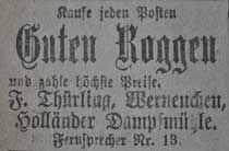 Bestellungen für den Monat März nehmen die Austrägerinnen, die Postanstalten und Landbriefträger an. Unter Hinweis auf die Versicherungsbedingungen machen wir darauf aufmerksam, daß die Unfallversicherung von 500 Mk. nur gültig ist, wenn das Abonnementgeld bezahlt ist und der Abonnent die richtig ausgestellte Quittung der Post oder der Expedition besitzt. Ahrensfelde. Vor einigen Tagen Abends wurde der Fleischerlehrling Zieme aus Werneuchen, der Fleisch nach Berlin fuhr, von zwei Strolchen überfallen. Er setzte sich aber ordentlich zur Wehr und ließ die Peitsche auf seine Angreifer herabsausen, so daß sie von ihm abließen. |