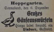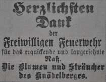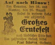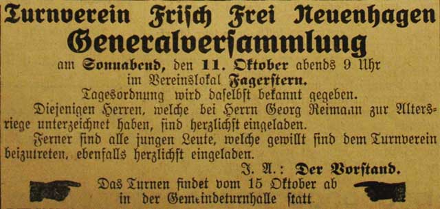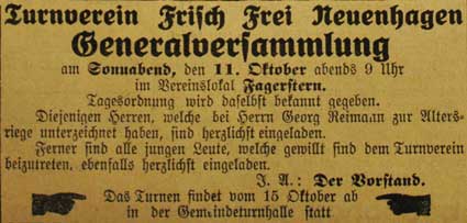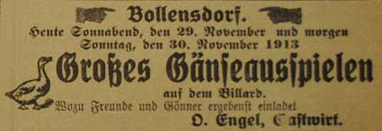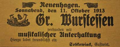 Schöffengerichtssitzung am 2. Septemb. 1913. ... Die Knechte Reiter und Albrecht in Blumberg hatten, wie das leider so oft vorkommt, von den beladenen Wagen Hafer verkauft und erhielten deshalb der erstere 1 Woche und der letztere 2 Wochen Gefängnis. Das Sedanfest wurde bei uns in üblicher Weise mit Ausflug der Kinder in den Wald und Abends Heimgang mit Laternen gefeiert. Der Männer-Turn-Verein begeht am Sonntag sein 53jähriges Stiftungsfest. Um 3 Uhr Marsch nach dem Schützenhaus, daselbst Wettturnen, abends Ball. |