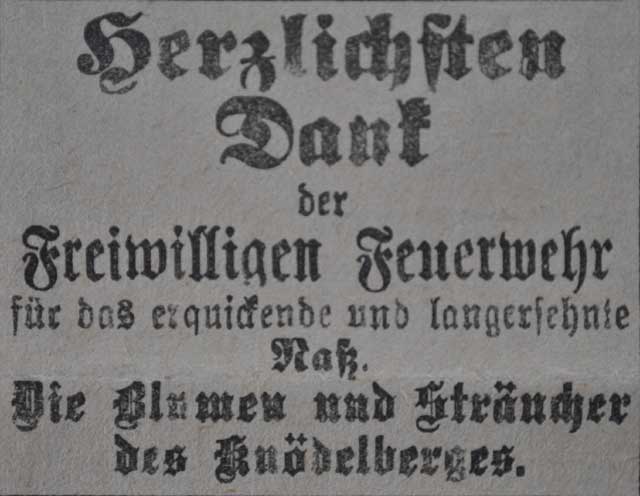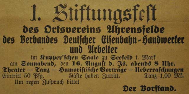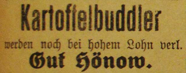 Hurra unsere Kleinbahn! Da die Maurer in Strausberg streiken, dachte die Maschine unserer Kleinbahn „das kann ich auch“ und blieb gestern früh mit dem 9 Uhr-Zuge in Hoppegarten stehen. Da gütliches Zureden nicht half, sondern die Maschine ihren Unwillen durch Prusten, Aschewerfen usw. kund gab, so blieb den Passagieren nichts anderes übrig, als zu Fuß nach den Gefilden unserer Stadt zu pilgern. Für die zahlreichen Besucher des Amtsgerichts nichts besonders erfreuliches. Dankenswerter Weise ließ die hiesige Verwaltung kurz nach elf Uhr einen Extrazug nach Hoppegarten abgehen, sodaß wenigstens hier der „Verkehr“ aufrecht erhalten wurde. ... Unsere Mitteilung über die Umgehungsbahn hat, wie das selbstverständlich ist, allgemeine Aufmerksamkeit erzeugt. Aus mündlichen, telephonischen und schriftlichen Aeußerungen, die uns zugegangen sind, geht hervor, daß sowohl die Einwohner unserer Stadt als die Bewohner des platten Landes bis Bernau hin, von dem Wert der Bahn überzeugt sind und daß sie die in einigen Kreisen Mahlsdorfs hervorgetretene Unzufriedenheit mit der Trasse, die allerdings das südliche Mahlsdorf durchschneidet, nicht verstehen. Die Möglichkeit des Verkehrs zieht den Verkehr an und Verkehr bringt Geld. ... Bei der großen Entwicklung, die der Zuckerrübenbau in Deutschland genommen hat, ist es interessant darauf hinzuweisen, daß die Wiege des Zuckerrübenbaues in unserer nächsten Nähe, in Kaulsdorf gestanden hat. Hier besaß der Professor der Chemie Franz Karl Achard ein Gut und hier nahm er die Versuche Marggrafs, der zuerst 1747 den Zuckergehalt der Zuckerrübe nachgewiesen hatte, wieder auf. Seit 1786 beschäftigte er sich auf seinem Gute mit eingehenden Versuchen über die beste Methode der Kultur der Zuckerrübe. ... Werneuchen. Am Mittwoch Nachmittag gegen 4 Uhr kam Feuer in der Scheune des Landwirts Georg Thürling in Weesow aus. Es entwickelte sich mit rasender Schnelligkeit, daß, als die ersten Löschmannschaften mit Spritze erschienen, schon der große Kuhstall, sowie Pferdestall in Flammen standen. Den Löschmannschaften, welche auch von den umliegenden Dörfern, auch die Werneuchener Freiwilligen Feuerwehr, erschienen waren, lag es nur noch ob, das Wohnhaus, welches schon Feuer gefangen hatte, zu retten. Nach großen Anstrengungen gelang es. ... |