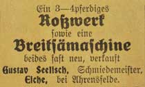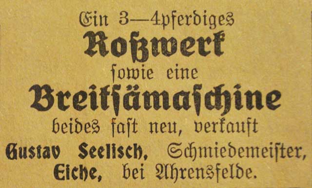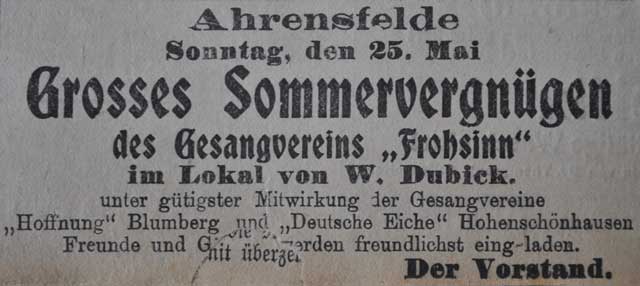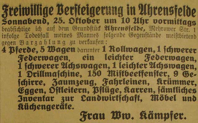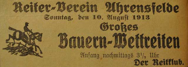 Die Einführung elektrischer Triebwagen ist für die Eisenbahnstrecke Eberswalde - Angermünde - Freienwalde und Wriezen beschlossen worden. ... Ahrensfelde. Pferde mit Wagen gestohlen wurde am Freitag dem hiesigen Gemüsezüchter Albert Kempfer in der Zeit zwischen 6-8 Uhr morgens vor der Ackerhalle in Berlin. Obgleich der Besitzer den Diebstahl sofort der Kriminalpolizei meldete, ist es noch nicht gelungen das Gespann ausfindig zu machen und den Dieb festzustellen. Im Laufe des Vormittags sollen die Pferde, ein Fuchs und ein Schwarzbrauner, beide kupiert, in Oberschöneweide gesehen worden sein. Es wird angenommen, daß die Pferde auf dem Lande verkauft worden sind. Der Besitzer hat demjenigen, welcher zur Wiedererlangung der Pferde wichtige Angaben machen kann, sodaß der Dieb festgestellt werden kann, eine Belohnung von 50 Mark zugesichert. Ahrensfelde. Wie wir aus sicherer Quelle erfahren, findet das diesjährige Bauernwettreiten bestimmt am Sonntag, den 10. August statt. Da der Verein zur Zeit über sehr gutes Pferdematerial verfügt, so dürfte das diesjährige Rennen ein sehr interessantes werden. |