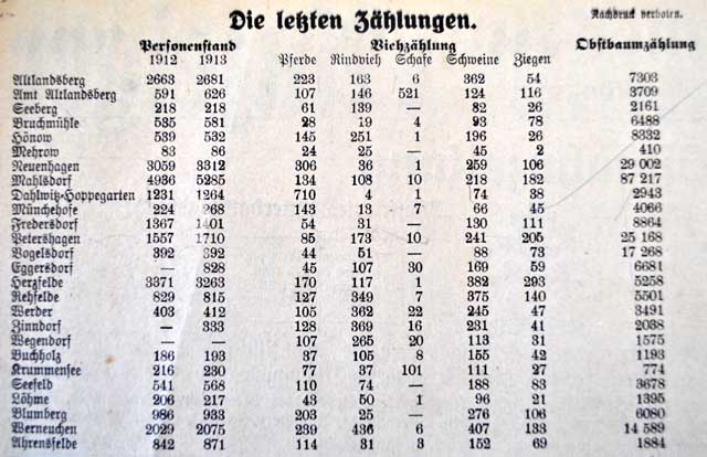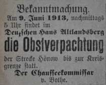 Die Kreischaussee Friedrichsfelde bis Marzahn wird vom 3. Juli d. Js. bis auf weiteres wegen Pflasterarbeiten für Fuhrwerke gesperrt. Die Kehrbezirke im Kreise Niederbarnim haben eine anderweite Einteilung erfahren. Kehrbezirk 17 (Altlandsberg) umfaßt folende Ortschaften: Altlandsberg, Bruchmühle, Eggersdorf, Fredersdorf mit Gut, Petershagen, Bollensdorf mit Gut, Vogelsdorf mit Gut, Münchehofe, Mahlsdorf, Dahlwitz mit Hoppegarten, Neuenhagen mit Gut, Seeberg, Hönow, Seefeld, Krummensee, Löhme, Blumberg. |