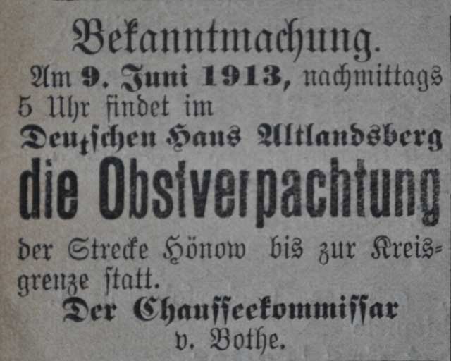 Amtliches. Die Kreischaussee Neuenhagen-Altlandsberg wird wegen Rohrverlegungsarbeiten für Fuhrwerke bis auf weiteres gesperrt. - Die Kreischaussee Bernau – Börnicke - Löhme wird vom 6. bis Ende d. Mts. wegen Ausbesserung der Fahrbahn für Fuhrwerke gesperrt. Wriezen. Das alte Stammgut derer von Barfuß, Rittergut Batzlow, bisher Herrn Staroste gehörig, ist in den Besitz des Geheimen Kommerzienrates Friedrich Karcher übergegangen. |