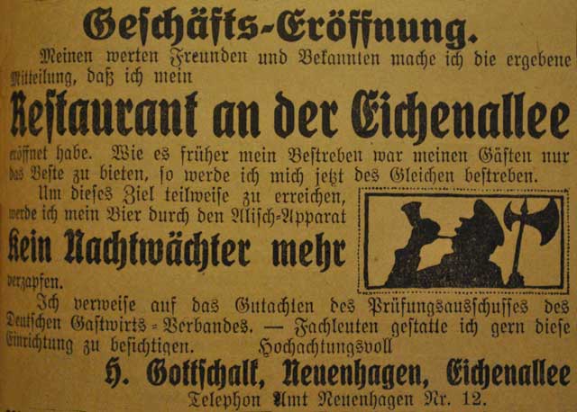 Schöffengerichtssitzung am 30. Septbr. 1913. ... Zwei Kraftwagenführer, Senft und Meyer, fühlen sich durch Strafmandate des Amtsvorstandes Dahlwitz, wonach ihre Fahrzeuge bei der Rennbahn in Hoppegarten übermäßig geraucht haben sollen, beschwert. Das Gericht kommt zur Vertagung und will zunächst einen Sachverständigen hören. Der Schankwirt Bernhard Reinhardtaus Neuenhagen hat seinen Gästen in seinem als alkoholfrei genehmigten Lokal auch einmal geistige Getränke auf ihr Drängen verabfolgt, eine Straftat, für welche das Gericht 10 Mark ev. 2 Tage Haft für eine ausreichende Sühne hält. Ein Fahrraddiebstahl wird dem Knecht Karl Piefke, seiner Zeit in Blumberg, jetzt in Berlin zur Last gelegt. Er erhielt 30 Mark Geldstrafe, ev. 5 Tage Gefängnis wegen Unterschlagung des Fahrrades. Johannisthal. Auf dem hiesigen Flugplatz wird in den nächsten Tagen der erste Leuchtturm für den Flugsport eingeweiht. Der Turm hat eine Höhe von ungefähr 25 Metern und das Leuchtfeuer, das nach Eintritt der Dunkelheit eingeschaltet wird, ist kilometerweit für die ankommenden Flieger zu sehen. Gestiftet ist der Leuchtturm von der Manoli-Zigarettenfabrik, die erst kürzlich einen namhaften Betrag für den Flugsport widmete.