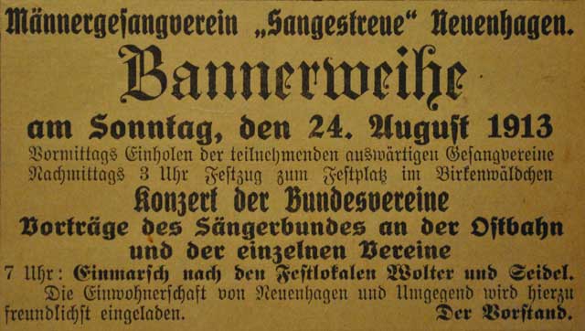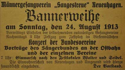 Neuenhagen. Am 24. August feiert der Männer-Gesang-Verein „Sangestreue“ seine Bannerweihe, verbunden mit Darbietungen von Gesamtchören des Ostbahnsängerbundes. Zahlreiche Einladungen an andere Gesangvereine sind ergangen. |