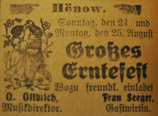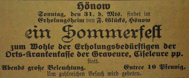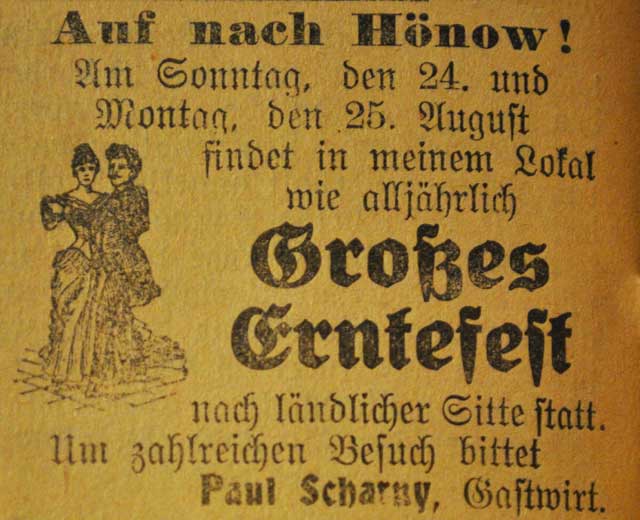 Fahnen heraus! In Neuenhagen feiert der Kriegerverein am Sonntag nachmittag das Regierungsjubiläum im Birkenwäldchen, mit Festrede abends Ball in mehreren Sälen, ebenfalls am Sonntag veranstaltet der Arbeiterverein Vaterlandstreu in Krummensee eine Feier. Am Montag veranstaltet der Landwehrverein in Fredersdorf einen großen Ummarsch, Pflanzung einer Eiche im Schulhofe, Belustigungen, abends Ball im Lokale der Frau Hörnicke, und der Landwehrverein Hönow ebenfalls mit der Jugend ein Fest, Ummarsch und abends Ball im Lokale der Frau Seeger. |