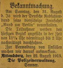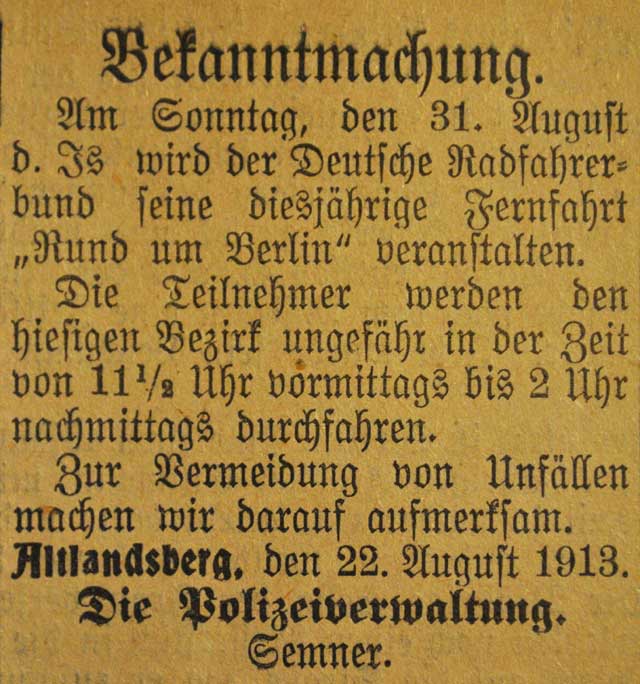 Bei der gestrigen Radfernfahrt Rund um Berlin gingen 277 Amateure in drei Gruppen von 6 Uhr morgens ab ins Rennen, um 7 Uhr folgten ihnen 60 Geldpreisfahrer. Das Tempo war von Beginn an überall schnell. Es wurde über die ganze Strecke beibehalten. Die 226,1 km lange Fahrt führte über Dyrotz, Nauen, Kremmen, Sommerfeld zur ersten Hauptkontrolle Oranienburg, dann nach Biesenthal, Werneuchen, Altlandsberg, nach Erkner, der zweiten Hauptkontrolle und weiter über Neu-Zittau, Friedersdorf, Mittenwalde, Königswusterhausen und Großbeeren zum Ziel Jagdhaus Stern nahe Potsdam. ... Der Wettflug Rund um Berlin begann am Sonnabend Nachmittag von Johannisthal aus. 22 Flieger erschienen am Start, 17 kamen glatt über die Strecke. Baierlein-München war erster auf Eindecker, Viktor Stoeffler-Berlin auf Doppeldecker. Die 102 km lange Strecke durchfuhr Baierlein in 1 Std. 35 Sek., Stoeffler 1 Std. 5 Min. 1 Sek. Am Sonntag mußten zwei Runden gemacht werden, für die verhältnismäßig weniger Zeit gebraucht wurde, da die Flieger die Bahn kannten. ... Werneuchen. Am Sonntag feierte unsere Freiwillige Feuerwehr ihr 5. Stiftungsfest, das von den Freiwilligen Feuerwehren der umliegenden Ortschaften selbst aus Freienwalde, Wriezen und Eberswalde und natürlich aus Altlandsberg recht gut besucht war. ... Mahlsdorf. Der Bankverkehr unserer Gemeinde mit der Preußischen Zentral-Genossenschaftskasse hat wegen der unverhältnismäßig hohen Gebührenforderungen dieses Instituts abgebrochen werden müssen. |
