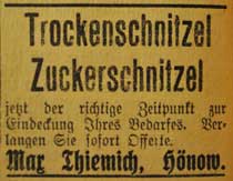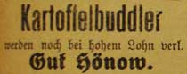 Im Erholungsheim Hönow sind zu verkaufen: 2 schwarze, zugfeste, russische Steppenpferde 500 Mark; echte Minorka-Hühner (dies- u. vorjährige) Stück 3 Mark; 1 engl. Dogge (Hündin) 60 Mark; 1 zahmer Storch 25 Mark. Besichtigung Sonntags erbeten. F. Glücks. |