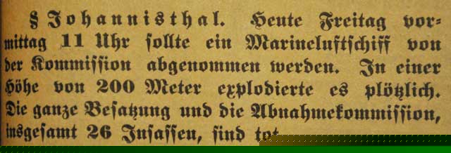 Nach der Zeppelin-Katastrophe. Berlin, 18. Okt. Die Trümmerstätte ist heute von Neugierigen belagert und wird auch in den nächsten Tagen noch von Menschen aufgesucht werden, die die letzten Reste des einst so stolzen Luftschiffes sehen wollen. Auf dem Weg zur Unglücksstelle - eine Wiese in der Nähe von Johannisthal - sieht man die Wagen des Kraftfahrerbataillons, die mit Trümmern des Luftschiffs beladen sind. ... Die amtliche Untersuchung der vom Reichsmarineamt eingesetzten Kommission hat jedoch wenig ermitteln können. Die Kommission nimmt an, daß die Katastrophe durch einen Vergaserbrand herbeigeführt worden ist, der infolge von Knallgasbildung Nahrung gefunden hat ... Die Aufbahrung der Leichen. Im Garnisonlazarett Tempelhof sind die Leichen der 28 Verunglückten aufgebahrt worden. Dort werden auch von heute Nachmittag ab die Angehörigen zugelassen. Fremden soll der Zutritt verwehrt werden. Die Beerdigung soll gemeinsam und wahrscheinlich auch in einem gemeinsamen Grabe erfolgen. ... Werneuchen. Der Bernauer Turnklub hatte gestern eine Turnfahrt hierher unternommen. Es waren ungefähr 80-90 Turner, darunter auch eine weibliche Abteilung. Gegen 2 Uhr wurde im Schützenhaus zu Mittag gegessen und gegen 4 Uhr begann der Dreikampf der Männerabteilung von Bernau, der ins humoristische schillerte: Steinstoßen beim Sitzen auf einem Stuhle, Seitsprung und 25 Meter Hüpfen auf einem Beine. ... Leipzig. Ausgebrochene Löwen. Ein Wagen der elektrischen Straßenbahn fuhr in der vergangenen Nacht in der Blücherstraße auf einen nach dem Bahnhof fahrenden Tierwagen des Zirkus Barum auf, wobei der Tierwagen zertrümmert wurde und acht Löwen entwichen. Unter dem zahlreichen Publikum entstand eine furchtbare Panik. Ein Löwe sprang durch die Tür des Hotels Blücher, lief die Hoteltreppe hinauf und setzte alles in Schrecken. Fünf Löwen wurden erschossen, die anderen im Hotel Blücher eingefangen. Diese wurden heute von den Wärtern des Zoologischen Gartens und Menagerieangestellten abgeholt. Der eine Löwe befand sich auf dem Boden, der andere war in eine Toilette eingesperrt. Die Tiere wurden vom Fenster aus auf den Laufgang hinausgejagt und dort durch Ueberwerfen von Netzen unschädlich gemacht.