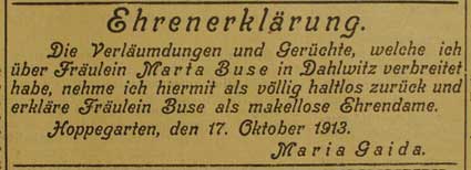 Nach einer Verfügung des Kgl. Provinzial-Schulkollegiums wird die Rangordnung in höheren Schulen, wonach die Schüler einen bestimmten Platz auf Grund ihrer Leistungen enthielten, in Zukunft wegfallen. ... Buch. Ein blutiger Kampf zwischen einem Förster und Wilderern hat sich in der Forst von Buch abgespielt. Schon seit längerer Zeit trieben dort Wilderer ihr Unwesen, ohne daß es gelingen wollte, sie zu überraschen. Nun hatte sich der Förster Bredereck an einer Stelle, an der die Wilderer besonders häufig ihrem Gewerbe nachgingen, auf die Lauer gelegt. Schon nach kurzer Zeit hörte er in geringer Entfernung mehrere Schüsse fallen, und sah dann zwei Männer auf eine Lichtung hinaustreten. Als der Förster die beiden anrief, rissen sie ihre Gewehre an die Wange, kamen aber nicht zum Feuern, denn der Beamte hatte sich ihnen blitzschnell genähert und schlug ihnen die Waffen aus der Hand. Nun drangen die Wilderer auf den Förster ein, und es entspann sich ein verzweifelter Kampf. Schließlich gelang es Bredereck, einen seiner Gegner durch mehrere Hiebe mit dem Hirschfänger kampfunfähig zu machen, worauf der zweite Wilderer die Flucht ergriff. Der verwundete Wilddieb wurde verhaftet, und noch am selben Abend konnte auch sein Komplice festgenommen werden. In der Strafsache gegen den Produktenhändler Hermann Friedrich Karl Schröder in Werneuchen, Chausseestr. 24, 50 Jahre alt, evangelischer Religion wegen Beleidigung hat das Königliche Schöffengericht in Altlandsberg am 28. Oktober 1913 für Recht erkannt: