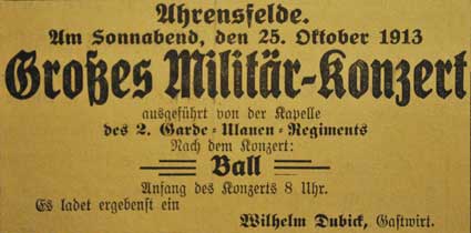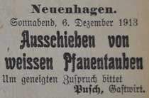 Die Abonnenten sind für den Fall des Todes, herbeigeführt durch Unfall, in Höhe von 500 Mark bei der Stuttgarter Mit- und Rückversicherungs-Aktiengesellschaft nach den besonderen Bedingungen versichert. Die Legitimation geschieht durch Quittung, für deren genaue Ausstellung und Aufbewahrung der Abonnent Sorge tragen muß. Werneuchen. Im Jahre 1912 wurden in unserer Stadt 54 Kinder geboren (21 Knaben, 33 Mädchen). Davon sind nicht weniger als 21 Kinder unter ein Jahr gestorben; eine erschreckend hohe Zahl. ... Neuenhagen. Für nächsten Donnerstag, den 9. d. Mts. steht uns wieder ein besonderer Genuß bevor, insofern unsere Orchestervereinigung im Fagerstern'schen Saale ein Konzert gibt, das durch die Kunst der Mitglieder und die Auswahl des in der vorliegenden Nummer abgedruckten Programms viel verspricht. ... Dahlwitz-Hoppegarten. Am Sonnabend hielt der hiesige Militärverein im Vereinslokal des Kam. K. Frohnert seine Jahresversammlung ab, die sich eines guten Besuchs erfreute. ... Mahlsdorf. In der Sitzung der Kaulsdorfer Gemeindevertretung regte der Gemeindevorsteher Herr Doß an, die drei Gemeinden des Amtsbezirks Biesdorf (Biesdorf, Kaulsdorf und Mahlsdorf) zu einem einheitlichen Gemeindewesen zu vereinigen. Einweihung des Großschiffahrtsweges durch den Kaiser. Anfang April 1913 wird die feierliche Einweihung des Kanals durch den Kaiser stattfinden. Der Kaiser wird zu diesem Zwecke von Berlin im Auto zur Besichtigung der Hauptwerke nach Eberswalde und nach Niederfinow fahren, wo er auch jedenfalls die Weiherede halten wird und von dort nach Hohensaaten zur Besichtigung der Ostoderschleuse. Nachdem diese beiden Hauptanlagen in Augenschein genommen sind, ist dann die Rückreise über Freienwalde a. O. geplant. |