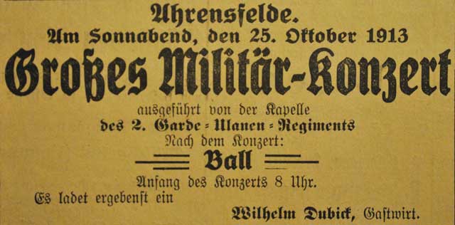 Ahrensfelde. Kaisersgeburtstag wurde hier vom Krieger- und Landwehrverein in ansprechendster Weise gefeiert. Nach einem von Fräulein Frieda Krüger gesprochenen Prolog und Darstellung eines lebenden Bildes hielt Herr Pastor Benecke die Festrede, in der er ein warmherziges Bild des Kaisers entwarf. Hieran schloß sich der heitere Teil mit Vorträgen und Theateraufführung, bei dem Fräulein Lucie Krüger und die Kameraden Rh. und Rd. Krüger, Jungnickel, Kütbach, Schweykart, Langmann, Grube, Degen und Brülke die Kosten der Unterhaltung und die Erfolge des Abends trugen. |