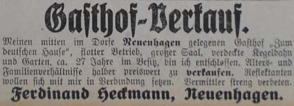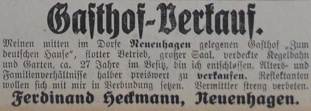 Neuenhagen. Bequeme Badegelegenheit bietet den Bewohnern von Neuenhagen und Umgegend das Erholungsheim Neuenhagen, das Herr Emil Peters auf dem gegenüber dem Bahnhof gelegenen früheren Besitztum des Herrn Stadtrat Dahm seit einigen Jahren eingerichtet hat. ... Bernau. Unsere Stadt hat die Errichtung eines eigenen Elektrizitätswerkes beschlossen; den Vertrag mit der Gasanstalt will sie nicht mehr verlängern. |
