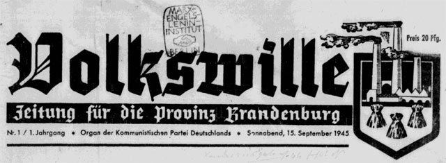 Zum Geleit! Berlin, den 15. September 1945. Endlich ist einem vielfältigen und alten Wunsche der antifaschistischen Bevölkerung der Provinz Brandenburg Rechnung getragen worden. Das schaffende Volk der Provinz Brandenburg hat eine eigene Zeitung erhalten. Noch sind überall die Folgen des hitlerischen Raubkrieges auch in der Provinz Brandenburg zu spüren. Aber doch regt sich überall neues Leben. Ein neuer fortschrittlicher, demokratischer Geist ergreift alle Schichten unserer Bevölkerung. ... Unsere neue Zeitung, der „Volkswille“, Zeitung für die Provinz Brandenburg soll ein Helfer sein, um aus der Vergangenheit zu lernen und allen Schichten der Bevölkerung den neuen Weg finden zu helfen, welcher aus dem Chaos in eine bessere Zukunft führt. ... Kommunistische Partei, Bezirksleitung der Provinz Brandenburg Sägebrecht |