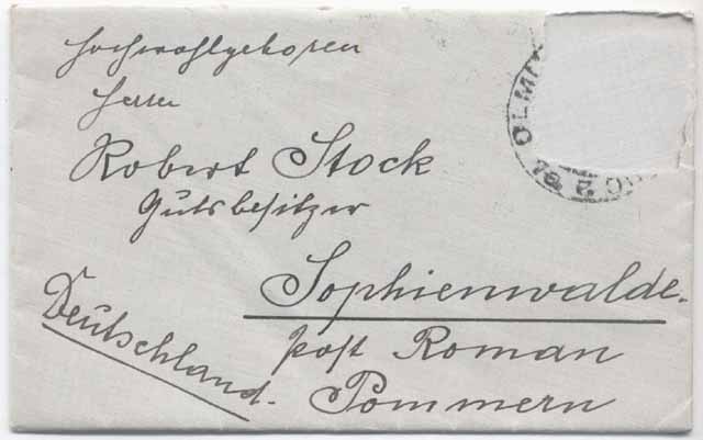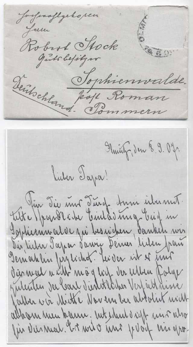 Elses Brief an "Papa" Robert Stock ist vom 8. September 1907 und kommt aus Olmütz (dem heutigen Olomouc) in Böhmen, wo offenbar beide in der Franz-Josef-Straße wohnen.