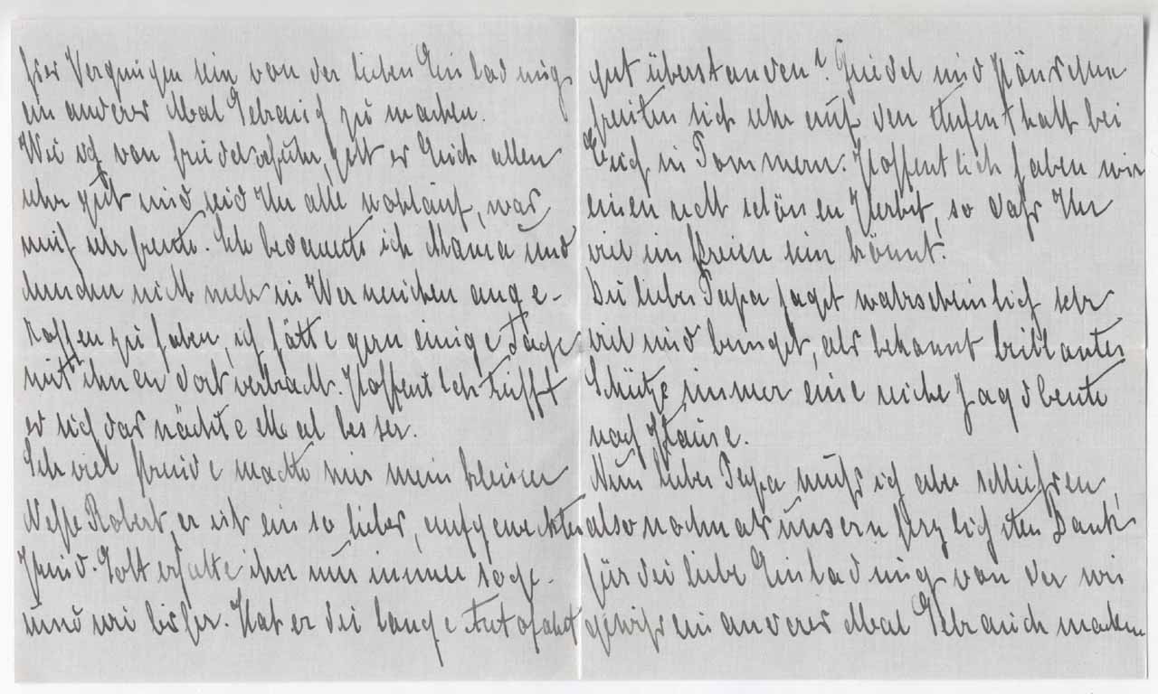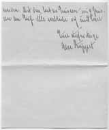 Für die uns durch Anni übermittelte freundliche Einladung Euch in Sophienwalde zu besuchen, danken wir Dir, lieber Papa sowie Deiner lieben Frau Gemahlin herzlichst. Leider ist es uns diesmal nicht möglich der selben Folge zu leisten, da Carl dienstlicher Verhältnisse halber vor Mitte November absolut nicht abkommen kann. Entschuldigt uns also für diesmal. Es wird uns jedoch ein großes Vergnügen sein von der lieben Einladung ein anderes Mal Gebrauch zu machen. Wie ich von Friedel erfuhr, geht es Euch allen sehr gut und seid Ihr alle wohlauf, was mich sehr freut. Sehr bedauerte ich Mama und Annchen nicht mehr in Werneuchen angetroffen zu haben, ich hätte gern einige Tage mit ihnen dort verbracht. Hoffentlich trifft es sich das nächste Mal besser. Sehr viel Freude machte mir mein kleiner Neffe Robert, er ist ein so liebes, aufgewecktes Kind. Gott erhalte ihn uns immer so gesund wie bisher. Hat er die lange Autofahrt gur überstanden? Friedel und Hänschen freuen sich sehr auf den Aufenthalt bei Euch in Pommern. Hoffentlich haben wir einen recht schönen Herbst, so daß Ihr viel im Freien sein könnt. Du lieber Papa jagst wahrscheinlich sehr viel und bringst, als bekannt brillanter Schütze, immer eine reiche Jagdbeute nach Hause. Nun lieber Papa muß ich aber schließen, also nochmals unseren herzlichsten dank für die liebe Einladung, von der wir gewiß ein anderes Mal Gebrauch machen werden. Mit den besten Grüßen und Küssen an Euch alle verbleibe ich und Carl Eure aufrichtige