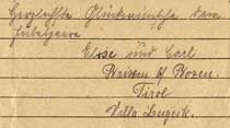 Unter den Glückwunsch-Telegrammen zur Hochzeit von Anna Stock und Max Bothe am 29. Juni 1918, die Anna sorgfältig zu einem Buch binden lies, findet sich auch ein Telegramm von Carl und Else Ruppert aus Tirol: | ||