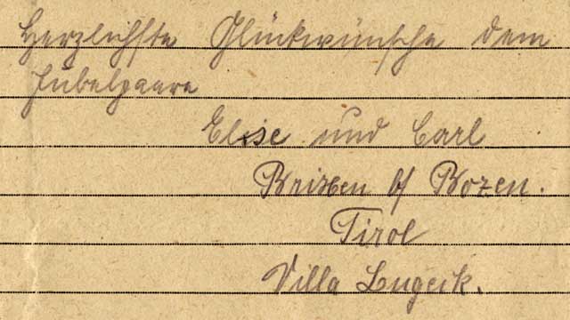 Auf der Rückseite des Telegramms ist nochmal fein säuberlichder Absender notiert: "Rittmeister Ruppert und Frau, Brixen bei Bozen, Villa Lugeck" |