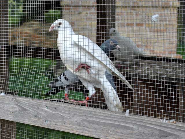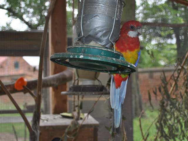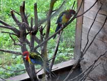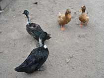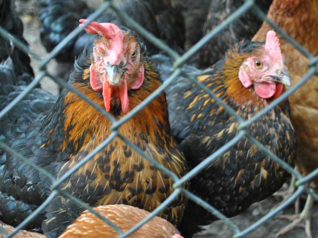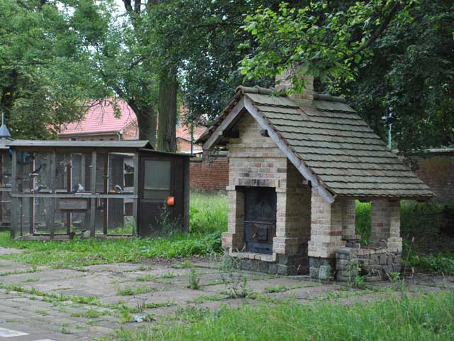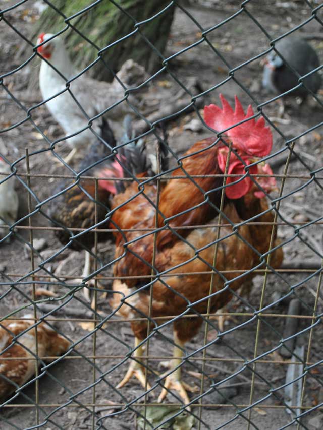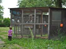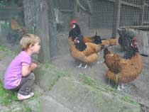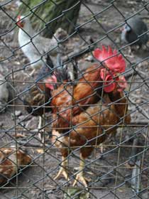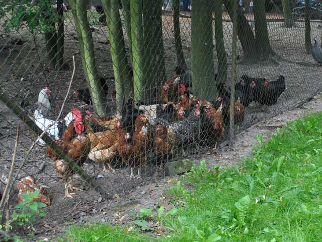 | Auf dem Weg von den Gehegen des Kinderbauernhofes zum leider ganz verwilderten Kräutergarten kommt man an einem Hühner-Gehege vorbei, in dem ordentlich was los ist: | ![]() |
