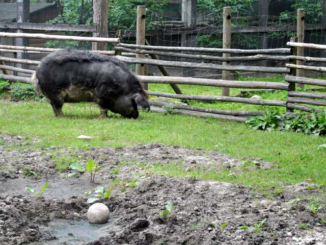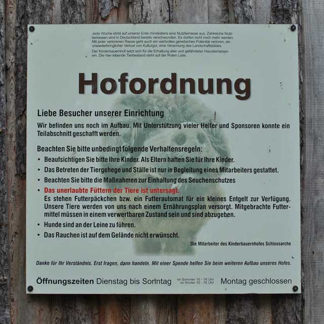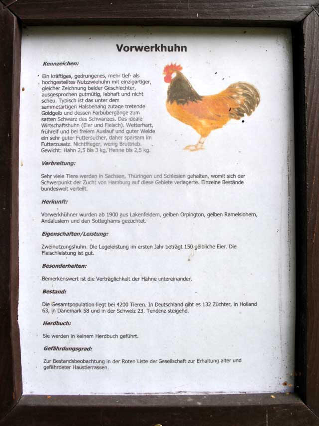 | An fast allen Gehegen erklären Tafeln die darin befindlichen Tiere, und ein Städter oder gerade erst aufs Land Gezogener kann hier seine Unwissenheit etwas mildern. | ![]() |