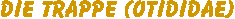 Trappen, Otididae, eine Familie der Kranichartigen, die mit 23 Arten in den Steppen Afrikas sowie Australiens und Eurasiens vorkommt. In Mitteleuropa (Brandenburg, Burgenland) lebt sehr selten noch die Großtrappe, Otis tarda, die im männlichen Geschlecht bis zu 15 kg Gewicht erreicht. In den Mittelmeerländern und Asien lebt die Zwergtrappe, Tetrax tetrax. |