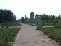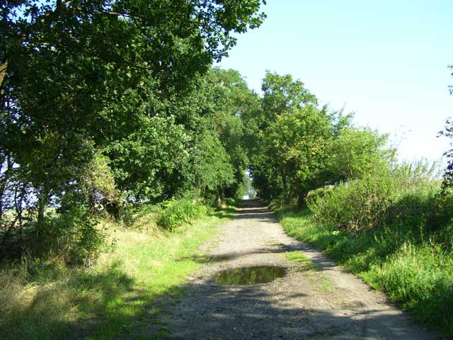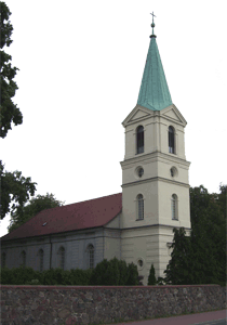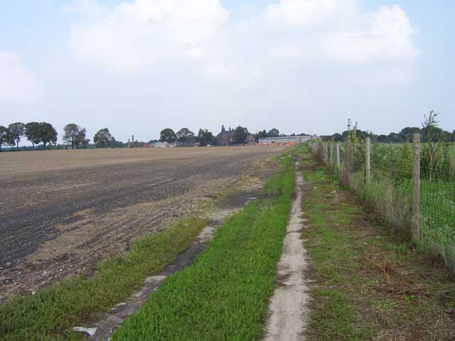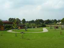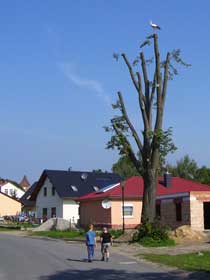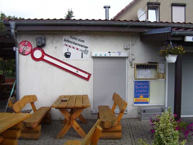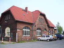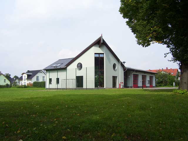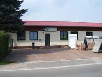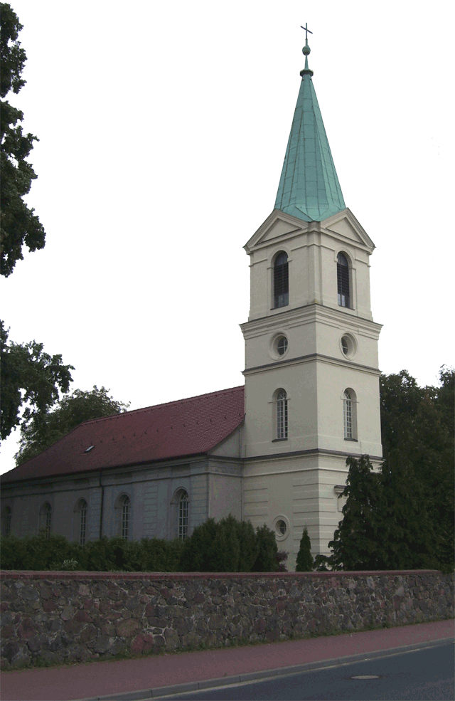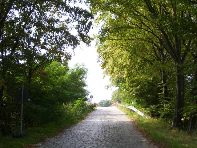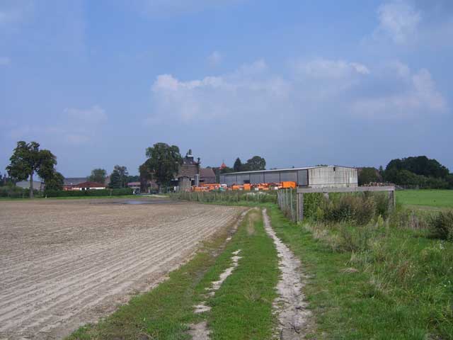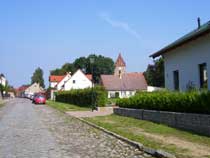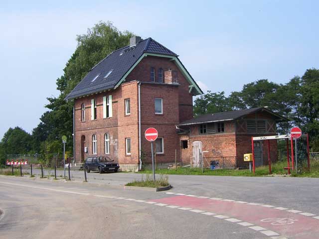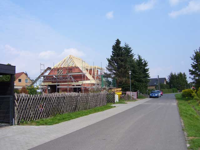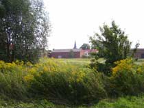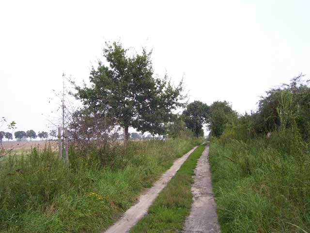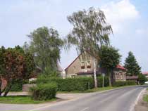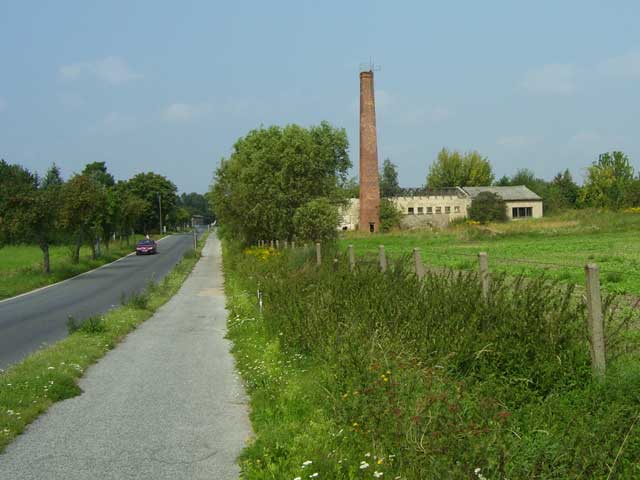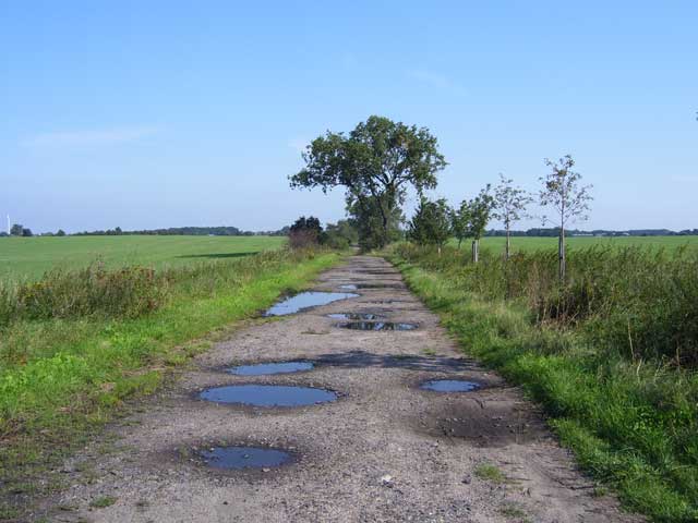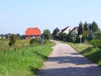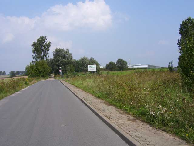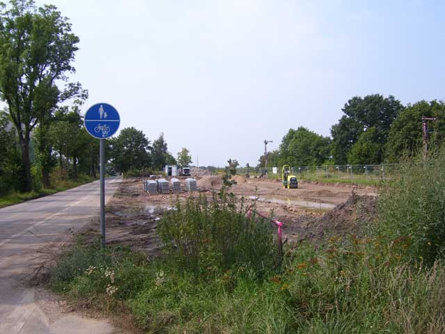 Der Weg, dessen Ausbau zu einem richtigen Rad- und Wanderweg schon seit Jahren versprochen ist, führt vorbei an einer Pferdekoppel, durch ein Spalier von Apfelbäumen und entlang eingezäunter Hecken, die erst vor kurzem angelegt wurden. Lange bevor der Turm unserer hübschen Dorfkirche zu sehen ist, fällt uns eine große, nicht sonderlich ansehnliche Halle mit einer Unmenge von Fahrzeuge davor ins Auge. |