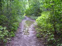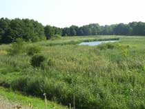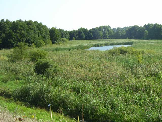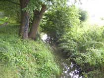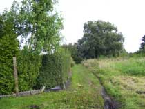 Die Lücken zwischen der Bepflanzung geben aber den Blick frei auf kleine Tümpel rechts und links des Weges, die früßer sogar mal Namen hatten. Der Tümpel am Ortsausgang auf der rechten Seite ist eigentlich Teil eines Grabens, der im weiteren Verlauf den Krummenseer Weg und die Trappenfelder Straße quert, sich im Dorfpark zur 'Laake' erweitert und weiter unter der Dorfstraße hindurch in Richtung der Hönower Seen führt. Drei Viertel des Jahres ist der Graben ausgetrocknet und der Tümpel recht winzig, aber nach Regenfällen, wie wir sie jetzt hatten, kann man Graben und Tümpel zu den Gewässern zählen. Und wenn es wie vor zwei Jahren lange andauernde kräftige Regengüsse gibt, dann steht das Wasser auch mal bis an den Weg heran. Die hufeisenförmige Form des Tümpels gab und gibt immer wieder mal Anlass zu Spekulationen, dass sich in dem eingeschlossenen, leicht erhöhten Teil eine Grabstelle aus dem Altertum befindet. |