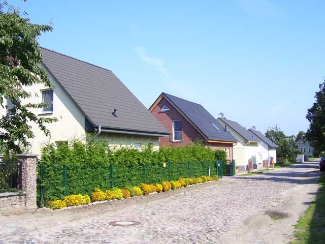 Aber auch ohne Tunnel kommt man auf die andere Seite des Gleises, wo eines der Ahrensfelder Neubaugebiete beginnt. Auch wenn die Häuser recht dicht stehen, am Rand und innerhalb des Wohngebiet gibt es ein paar grüne Inseln, in denen auch immer mal wieder die Wuhle zu Tage tritt, die auf dem Friedhofsgelände ihre Quelle hat und teils oberirdisch, teils in Rohren durch Ahrensfelde fließt, dann die Grenze zu Berlin markiert und weiter durch Kaulsdorf und Köpenick nach Spindlersfeld fließt, wo sie als recht stattlicher Bach in die Spree mündet. |