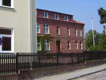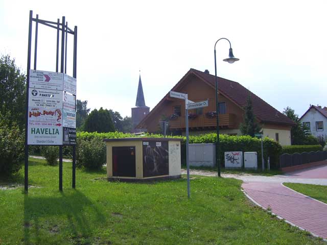 Berliner Straße zu sehen (Bild unten). Vor der Errichtung einer Ortsumfahrung (die jetzige B158) im Zusammenhang mit dem Autobahnbau 1935/36 floss der Verkehr von Berlin über Blumberg in Richtung Werneuchen durch jene Berliner Straße. Das turmförmige Gebäude links im Bild, das wir uns bei Gelegenheit mal genauer ansehen, war ehemals ein Transformatorenhaus der "Märkischen Elektrizitätswerker" (MEW) und ist jetzt zu einem stattlichen Wohnhaus ausgebaut worden. |